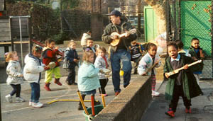 “It’s jam, but arranged.” Eddie Farley’s definition of swing. I am lucky enough to be the music teacher in a nursery school that has a playground full of interesting things like milk crates, oil drums and wooden building blocks and a staff who allow the children to stretch themselves in finding what they can do with them. We regularly have a jam session in the playground. We have a repertoire of songs that provide a range of good musical forms (Zum Gali Gali, New River Train, Tingalayo, Wheels on the Bus etc.) I give quite strong rhythmic leadership using my mandolin. Children choose the songs and are allowed to come and go and participate in any way they like short of violence. It is very useful to have another adult around. After one jamming type session I made a note of some of the many different ways that children joined in. Children were using beaters (dowel sticks) to play a range of things including - the ground, a fence, the side of a shed, hand held percussion instruments, large wooden building blocks, a chair and plastic oil drums. (Most are in some way relating to the common pulse. If things get absolutely out of time I might stop and do some synchronising. If someone is doing a rhythm I like I fall in with it.) One group built a structure with large wood blocks that was like a drum kit that they sat inside and played. They spent as much time organising and reorganising their set up and defending it against interlopers as they did playing. A group laid out some blocks in a row and used it as a stage, standing on it Top of the Pops style using beaters as microphones. One extrovert performed extravagantly and a small group provided him with an audience. Most children spent some time dancing. Some children got out plastic tennis racquets and played along, guitar style. At one point a child who is generally very noisy put his hands over his ears and said it was too loud so we negotiated a halt to the shed playing and all performed a dramatically quiet version of Twinkle Twinkle. In these very fluid situations an even wider range of responses is possible. One child called Alvin is a real speed merchant. Anyone will be familiar with this type - if there is a vehicle available he (and it often is a he) will be in it, on it, in front of it or behind it and always travelling fast. We gasp at the skilful and fearless way he weaves in and out of obstacles, we envy his fierce joy, and sometimes are afraid that he will end up killing someone. Alvin screeches to a halt at the edge of the session, a trolley in tow and we sing a song about him zooming around in a car. Half way through the first verse I look up to see him disappearing round a corner in the distance. My reaction is to think he is only interested in zooming about and not receptive to our song but soon he is back wanting the car song again. The minute it starts he’s off at about a hundred miles an hour. We are providing a sort of sound track to his activity, a celebration. Personal Jamming If we are to lead our pupils on a creative musical journey we have to have some experience of our own to work from. "There is an inner life which is the world of final reality, the world of memory, emotion, common sense and which goes on all the time consciously or unconsciously, like the heart beat. There is also the thinking process by which we break into the inner life and capture answers and evidence to support the answers out of it. That process of raid, or persuasion or ambush, or dogged hunting, or surrender is the kind of thinking we have to learn, and if we do not somehow learn it, then our minds lie in us like the fish in the pond of a man who cannot fish." How are we to gain access to our musical fish? We have to start somewhere. Solo jamming is what we need............ You can see that these are simply loosening up exercises. We loosen ourselves physically and also our grip on the structures we have learned so we can recombine things in new ways. A song is stripped back to its framework like the wire frame a sculptor might use. Different things can be built on the same framework or we can take the framework itself to pieces and use only some parts in a different configuration. It may be that parts of the framework itself can be distorted or stretched - one thing that often happens to me in the jamming phase is that melodic lines come in phrases that don’t fit in a regular time signature. I find this a very productive area to work in. I imagine us, particularly in the droning mode, not as the fisherman in Ted Hughes’ analogy but as divers floating in a sort of primordial soup of musical elements and the patterns that connect them. The patterns in the higher levels might be musical structures like ABAB and on a deeper level scales, rhythms and pulses. Deeper still we swim in unstructured and blended sounds. I imagine individual cells connecting to form chains in random ways. Our own motion affects the ways in which the chains emerge. We collect some that appeal to us. In order to “see” new or less familiar chains we have to loosen our focus. We have with us a set of templates that we can try out on this raw material. The more flexible our templates the more they can contain or alternatively the better we can manipulate our templates the more ways we will find of applying and combining them.The deeper we dive the fewer templates we are able to carry with us. ................ Learning and Creativity Jamming is a good way of learning and creating because : it involves the whole of a person it provides the repetition that is necessary for someone to own their music and join it up with all their different parts it helps develop confidence it enables the absorption of subtleties, fluency and style from the teacher (the model here is that of the master and the apprentice) it encourages a playful attitude towards structures (turning things on their head, imposing styles or structures from one area on material from another) i