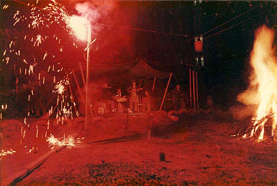 photo...Rick Lupi A piece in six movements for four musicians, bonfire and pyrotecnics Overture - Playing with Fire - Red War - Holy Smoke - Crash - Slow Air Total 40 minutes Click to hear an excerpt from "Overture" (mp3, 972 K) Click to hear an excerpt from "Playing with fire : tune" (mp3, 972 K) Click to hear an excerpt from "Holy smoke" (mp3, 940 K) Playing With Fire was performed at Calthorpe Adventure Playground, Kings Cross London. It was conceived and composed by Steve, except for Red War composed by Cliff Stapleton. Thanks to Rory and Guy for major contributions in the more improvised parts. Jonathon Graham had a lot of input in the planning of the piece as well as building the fire and performing with the pyrotechnics. Thanks are due to all the participants, who worked without payment, to my brother Chris for assisting with the fireworks, to his partner Jean for stew on the day and to the courageous manager of the playground. Rory McLeod : harmonica, slide guitar, voice The Drones was born at this gig. Click for an excerpt from "I have heard the mermaids singing each to each" (mp3, 691 K) Click for an excerpt from "Roll on thou deep and dark blue ocean roll" (mp3, 550 K)