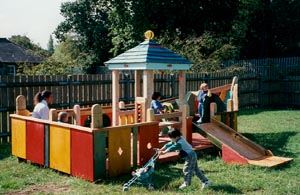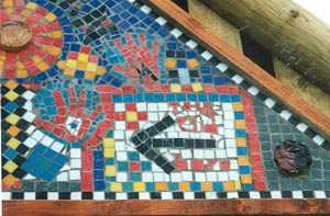 This is a detail showing childrens' work incorporated into a larger structure in an adventure playground in Barnet.
